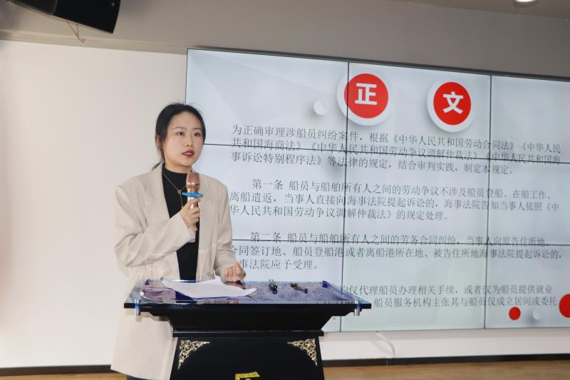 新法速遞環節,由實習律師杜婉婷結合自身工作經歷及近期工作情況,以《最高人民法院關于審理涉船員糾紛案件若干問題的規定》為依據,從該司法解釋共二十一條規定詳細解讀出發,分享了對涉船員糾紛的船員勞動合同與勞務合同、居間合同等不同法律關系的認定及解決路徑的問題。聚焦船舶優先權的確認、船員工資報酬的構成等問題,探討了船員違法作業情形下工資是否應予保護,勞務情形下侵權責任的承擔、工傷情形下工傷保險待遇與民事損害賠償的相互關系。并對涉外勞務合同的法律適用等海事司法實踐中急需解決的現實問題做出了分析。杜婉婷通過立法背景和立法需求對法律條文進行了詳細分析,讓大家較為全面的了解該新出臺的司法解釋。